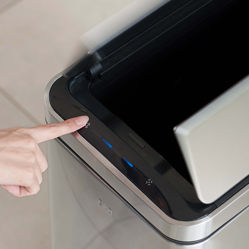 手をかざすだけで開くセンサー式ゴミ箱。表面は汚れや指紋が付きにくいフィンガープリントレジスタント加工を施しています。